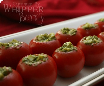 Another great way to serve cherry tomatoes... stuff the babies! Great secret for stuffing items like cherry tomatoes, strawberries, etc... put them in an egg carton slot to help hold the suckers still until you can get them stuffed! Source
