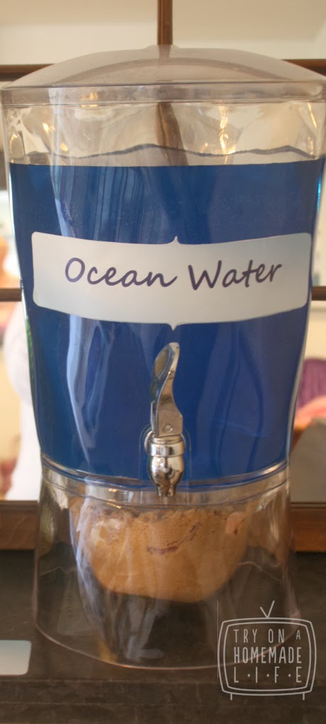 Don't forget to get fun with what you serve! Use a blue drink and mark it "ocean water", serve fish sticks, gold fish & potato chips could be "fish and chips", use a cookie cutter to "chomp" off the edges of sandwiches or cheese, etc to look like shark bites! pic Source